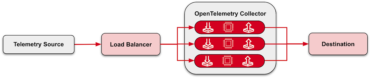 In gateway mode, telemetry data is sent to a load balancer, which then determines how to distribute the load amongst a pool of Collectors. Because you have a pool of Collectors, should one Collector in that pool fail, one of the other Collectors in the pool can take over. This keeps data flowing to your destination sans disruptions. Gateway mode is commonly deployed per cluster, data center, or region.