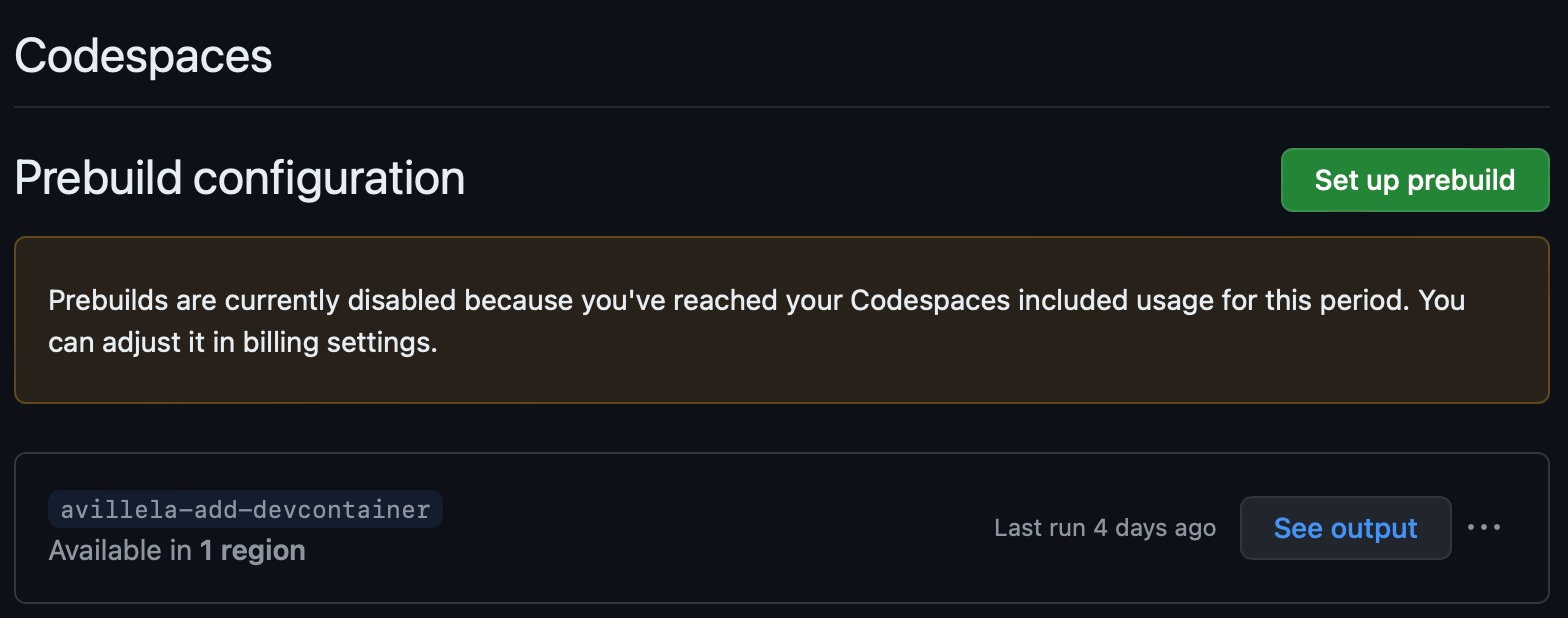 NOTE: If you run out of your Codespaces quota for the month, your pre-builds will be disabled. You need to either wait for it to reset next month, or pay up.